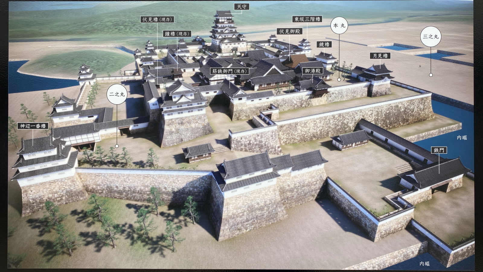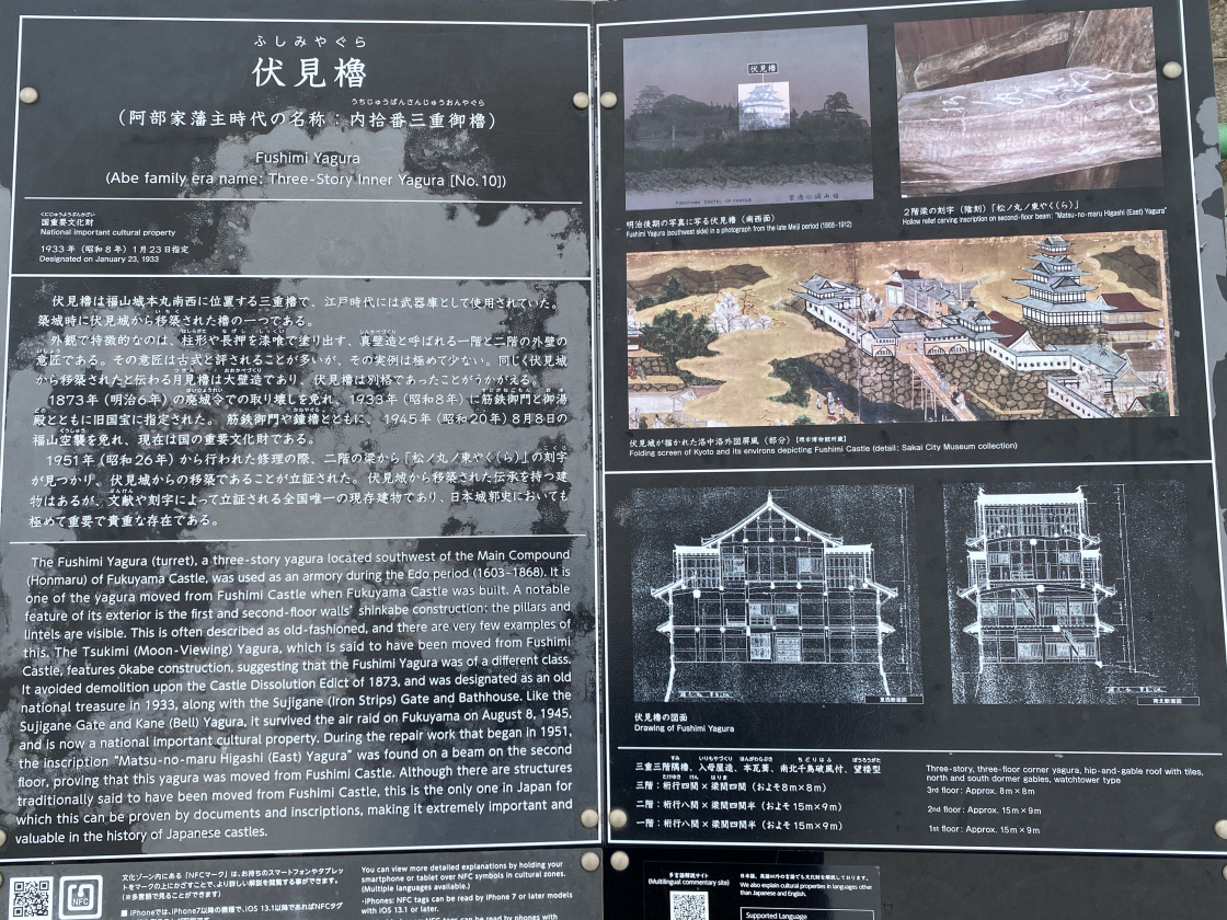 | ●本丸南西隅にある伏見櫓(現存、重文)。築城時に京都伏見城から多くの建物が移築され、伏見櫓もその一つ。 解説板 |