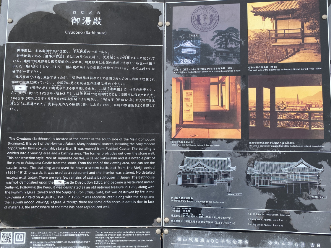 | ●筋鉄御門から入ってすぐの所にある御湯殿(昭和に外観復元)。本丸側からの眺め。 解説板 |