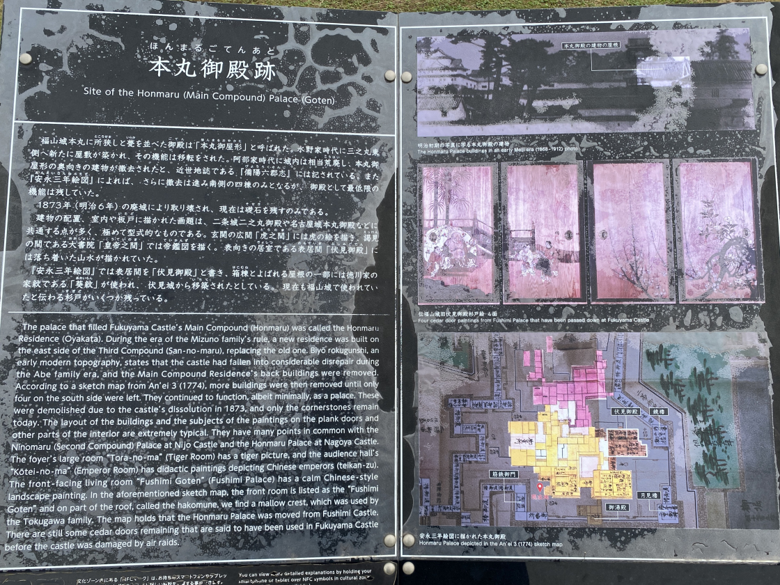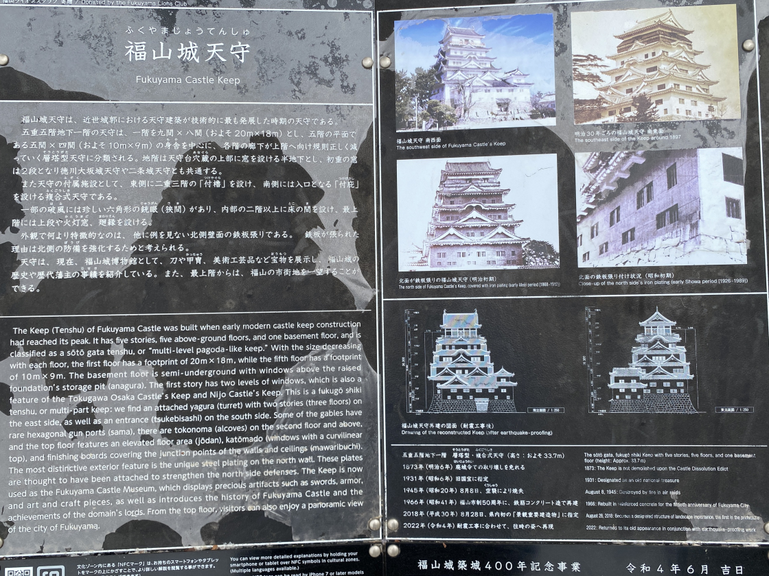 | ●二之丸に移設された旧天守礎石。天守は廃城後も破却を免れていたが、福山大空襲で焼失した。 ★解説板 |