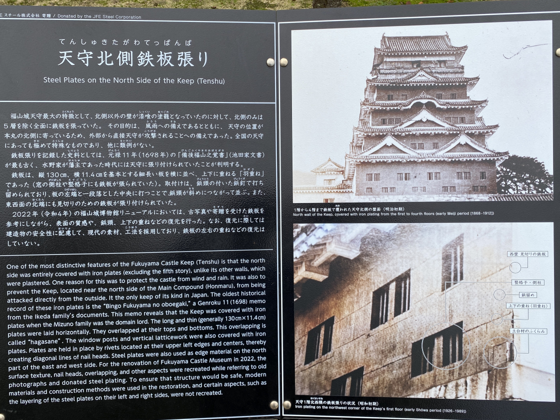 | ●北面は砲撃対策として鉄板(t=3mm程度)が最上層を除いた壁面全体に張られていた。 解説板 |