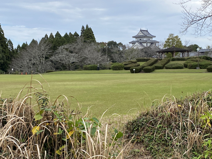 | ●広場越しに天守の眺め。丘陵上にあり、発掘調査で6つの曲輪と本丸建物跡が確認されている。 ★マップ |