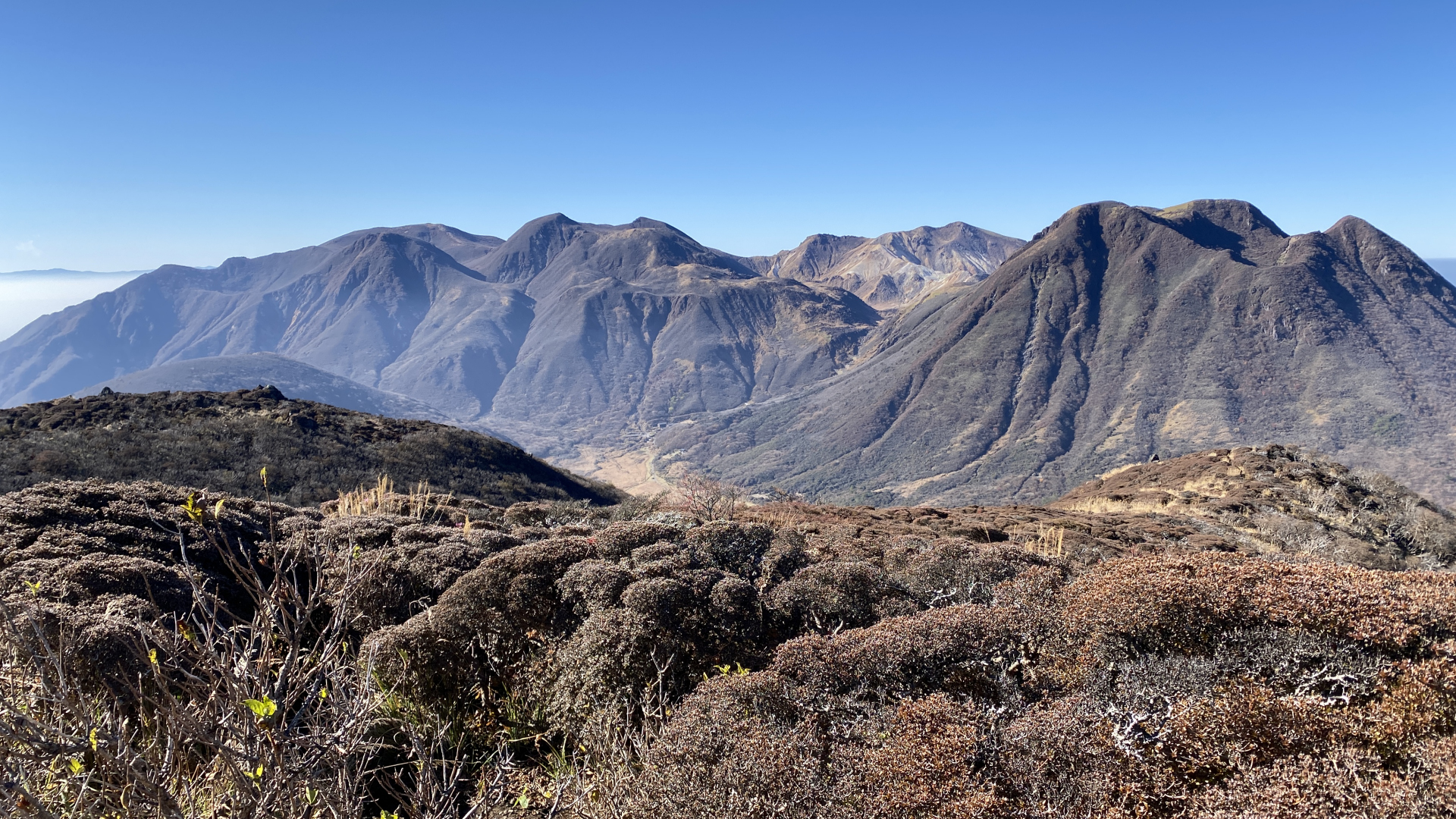 | ●山頂から東向いて大船山方面の眺め。坊ガツル避難小屋が見える。 |