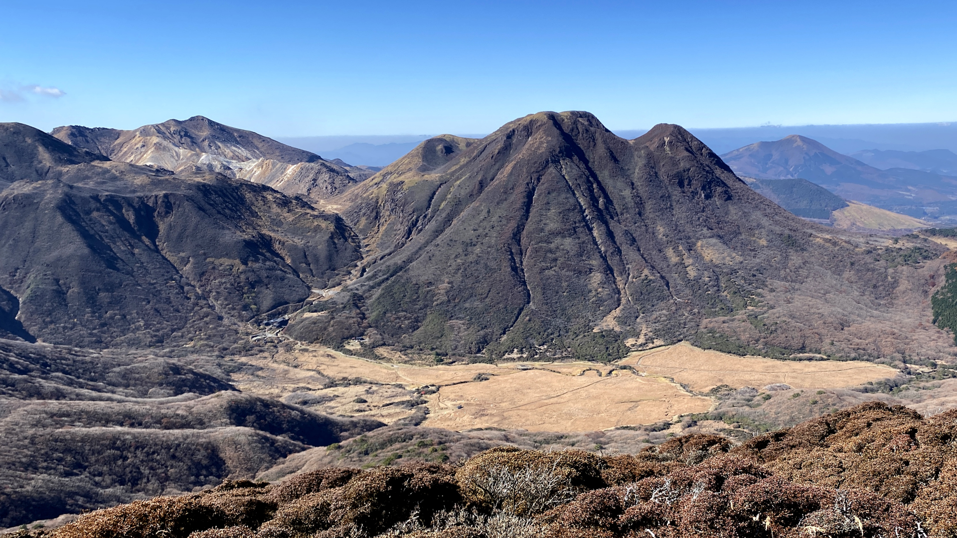 | ●山頂から赤川登山口方面の眺め。火砕流からなる緩傾斜の久住高原が広がる。 |