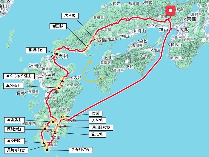 | 1)1日目。マイカーで兵庫県神戸市へ。宮崎カーフェリーに乗船し、神戸港を夕方出航して九州へ向かった。 撮影地 |